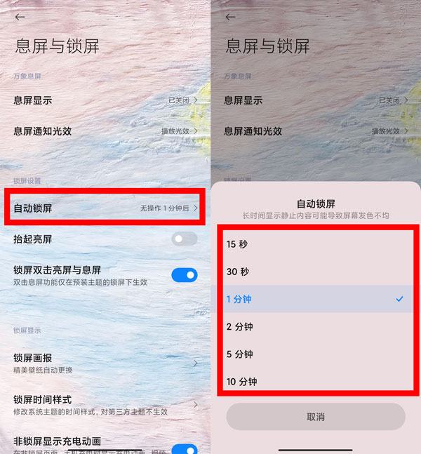 2、点击【自动锁屏】 ,勾选自动锁屏时间即可。
