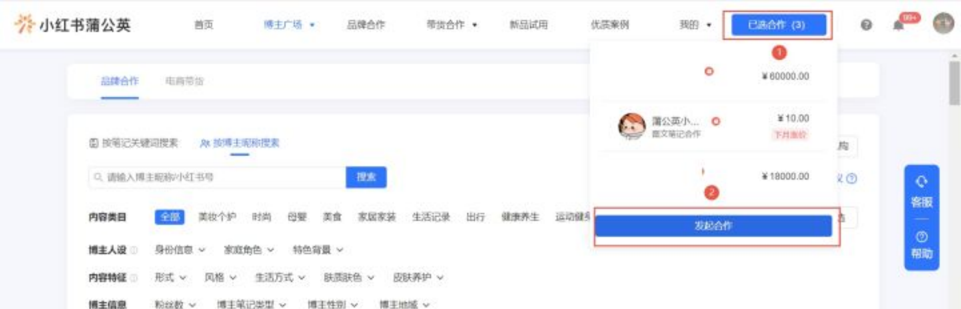 2)【已选合作】下单:点击【已选合作】-【发起合作】,选择已在列表中的博主确认结算。