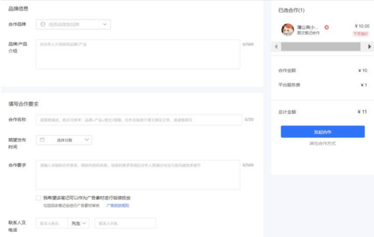 填写好合作需求后点击【发起合作】即可完成下单。