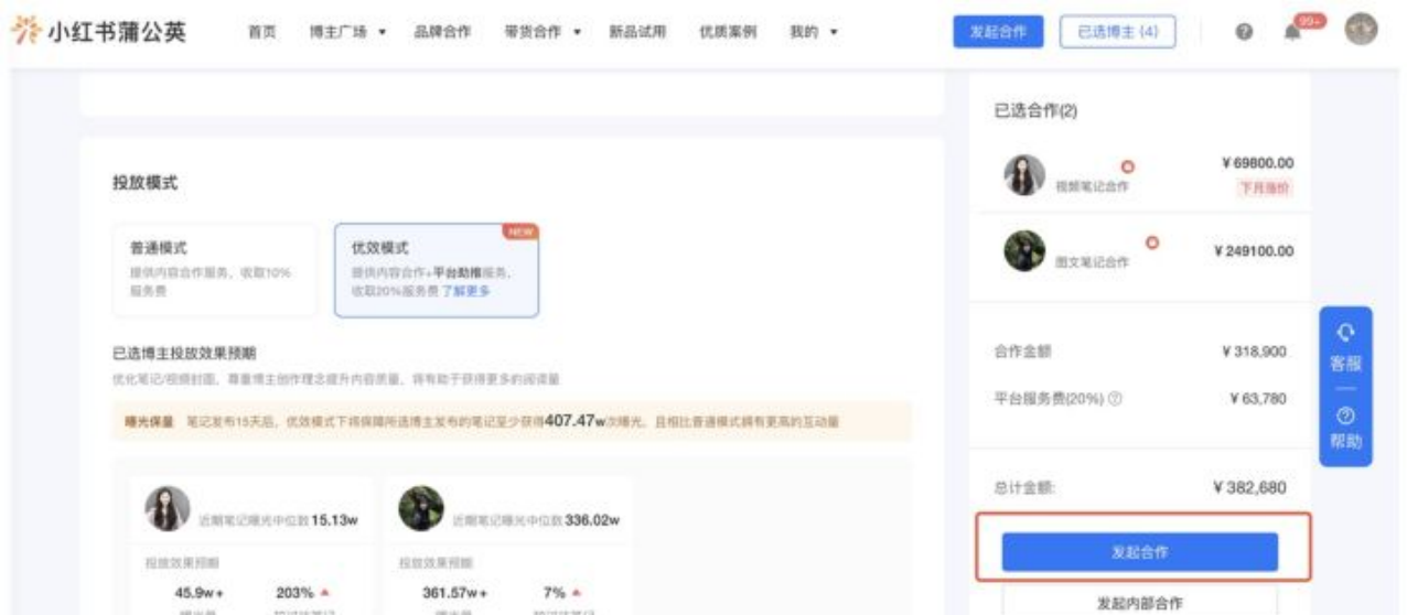 在下单的时候可以选择投放模式,普通模式或者「优效模式」。普通模式仅提供内容合作服务,收取10%服务费。「优效模式」提供内容合作+平台助推服务,收取20%服务费。