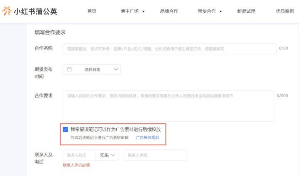 若希望该笔记作为广告素材进行后续投放,可以勾选广告素材审核。 发布笔记后将经过内容审核和广告审核,有可能增加审核时间。为提升过审率,请品牌与合作人认真阅读广告投放规则,确保素材符合审核规范。