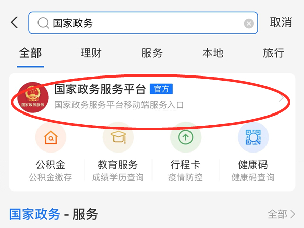 1、打开支付宝app,在首页搜索“国家政务服务平台”进入。