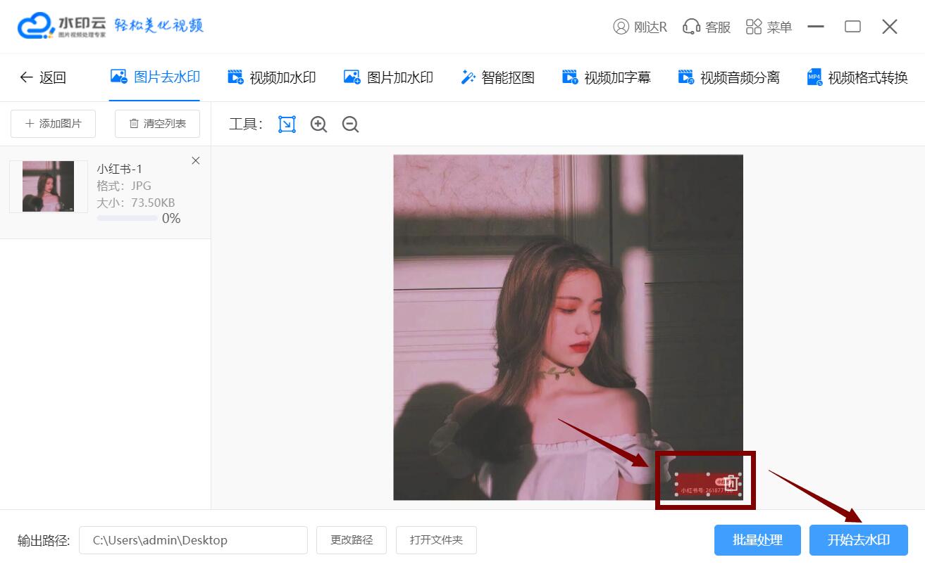 01.一键去除图片水印 点击“添加图片”按钮,或复制图片链接解析(支持多种图片格式一键解析)。上传完成后,根据水印区域大小调整选择水印区域,完成后点击“开始去水印”处理完成后保存即可。