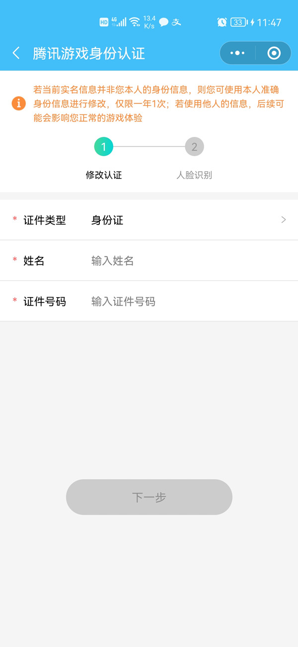 对于已经纳入防沉迷保护的未成年用户无法修改实名认证。其他用户可一年可修改一次实名认证,且修改时需要进行人脸识别。具体操作如下: