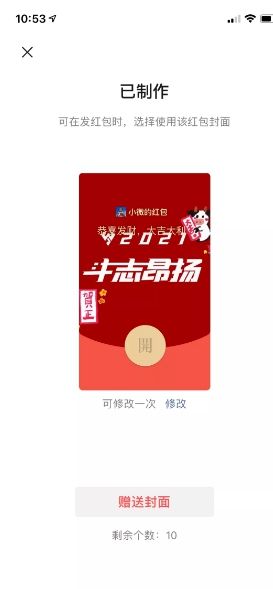 制作完成就可以「赠送红包封面」,发给好友or聊天群都可以,需要敲黑板的是,免费红包封面只有10个,给最亲近的人还是够用的,但是呢!玩游游小编还发现了一个“羊毛”,可以让制作的免费红包封面达20个,具体操作就是,修改红包封面。