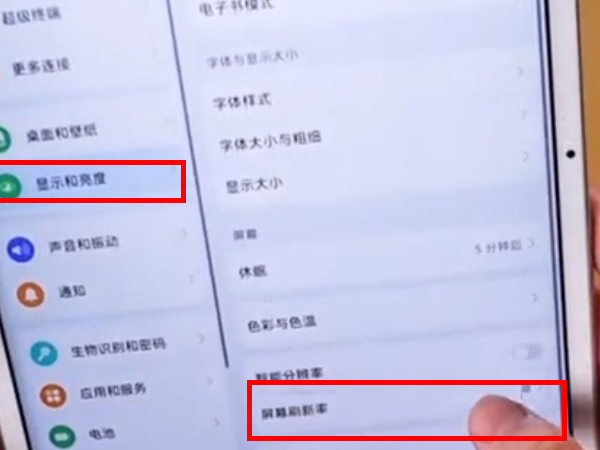 1、在平板设置中点击【显示和亮度】,点击【屏幕刷新率】。