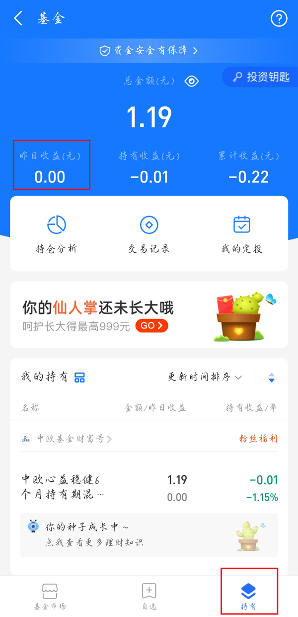 2、点击【持有】,即可看到昨日收益。