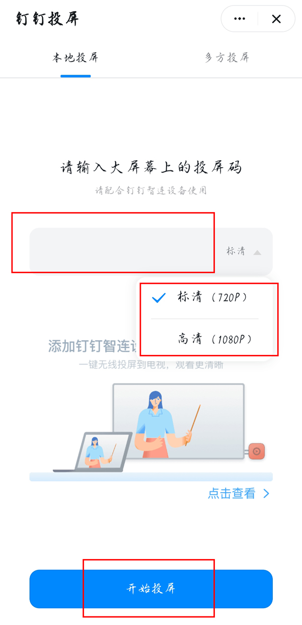 钉钉投屏码在投屏设备屏幕上会显示投屏码。钉钉投屏码连接投屏方法如下: