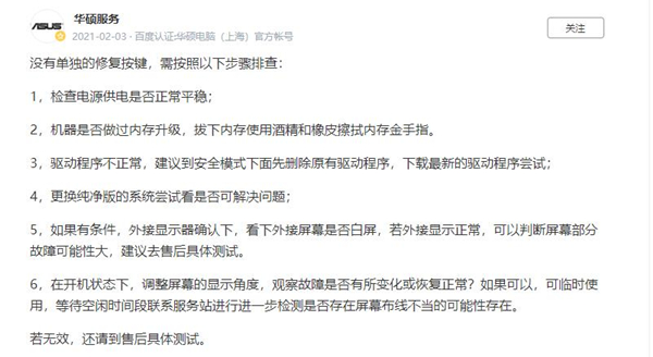 华硕电脑白屏了没有单独的修复按键,可以检查电源供电是否正常平稳;机器是否做过内存升级,拔下内存使用酒精和橡皮擦拭内存金手指。