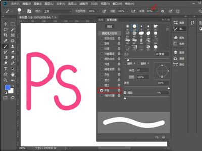 2、选中平滑选项,并在画笔的选项栏设置平滑的百分比即可。