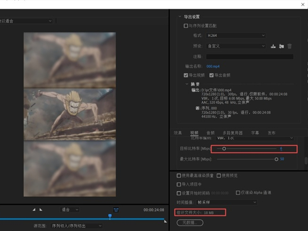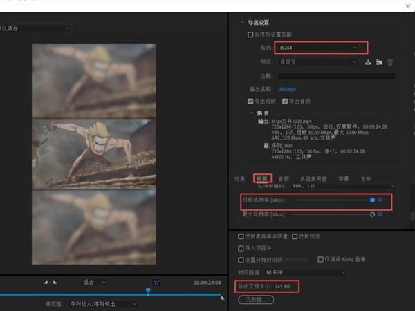 1、同时按下ctrl+m导出,我们可以看到比特率这时候是50,文件大小为145mb。