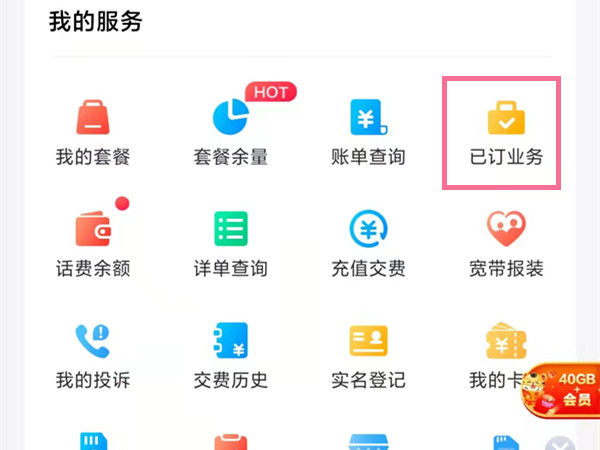 1、打开中国移动app,在“我的”界面点击【已订业务】。