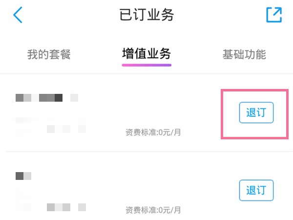2、在【增值业务】中找到流量包业务,点击【退订】即可。