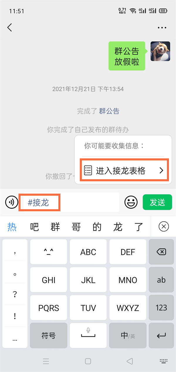 2、在编辑框输入“#接龙”后,点击进入接龙列表。