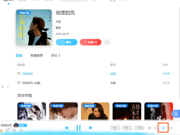 2、播放歌曲后,在下方有一个词的图标,点击即可将歌词显示在桌面,再次点击可以关闭桌面歌词显示。