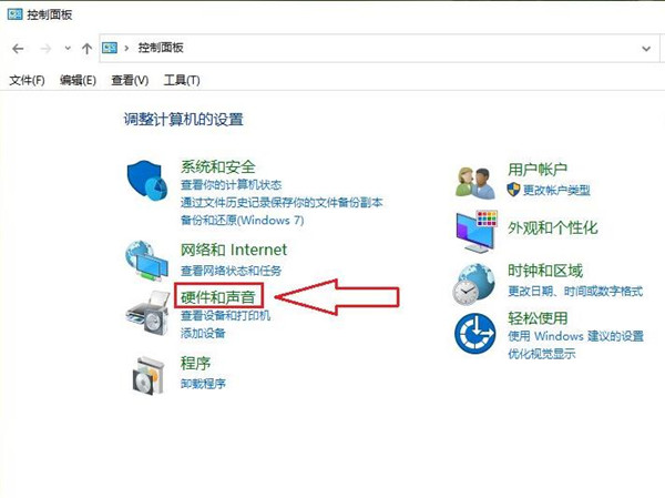 1、在开始菜单中点击控制面板,选择【硬件和声音】。