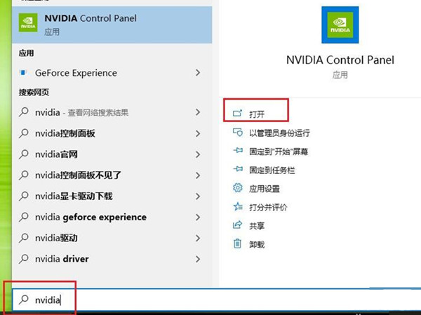 或者点击电脑左下角的搜索框,输入“nvidia”,点击【打开】。