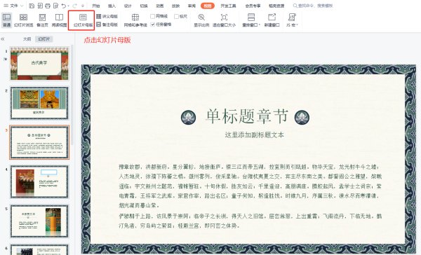 2、点击【视图】里面的【幻灯片母版】选项。