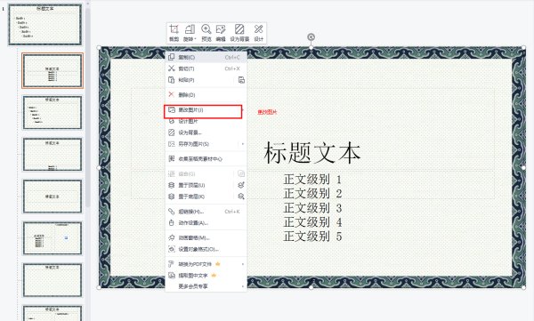 3、选中最顶部的母版,在上面右键,选择【更改图片】,选择需要更换的图片,更换成功后点击保存。