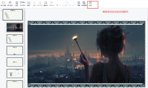 4、更换图片成功并保存后,点击幻灯片母版里面的关闭母版视图即可。