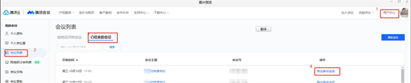 如果您是会议的创建者,在会议结束后您可以登录腾讯会议官网,单击【用户中心】,进入“会议列表”,在已结束会议中单击【导出参会成员】。