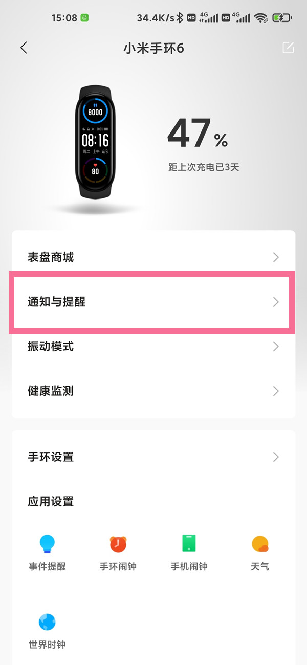 1、打开小米穿戴APP,进入绑定的小米手环6详情页,点击【通知与提醒】。