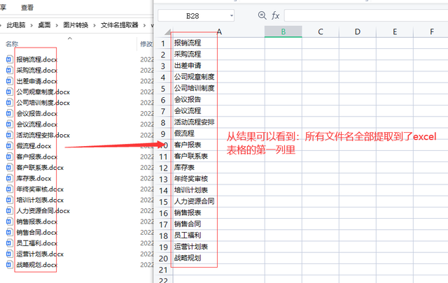 第4步,打开这个excel文件,通过对比可以看到,所有文件名全部提取到了excel表格的第一列里面。