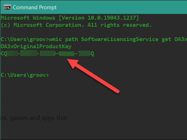 2、输入wmic path softwarelicensingservice get OA3xOriginalProductKey命令后,按下回车键即可查看产品密匙。