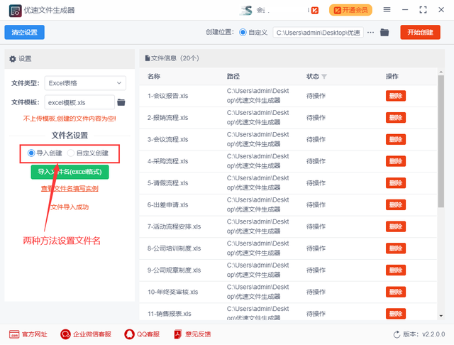 步骤2,进行文件名的设置,支持两种方式:导入创建就是上传包含文件夹名称的excel文件(文件夹名称从第一列的第一格开始往下填写);自定义创建则可以设置创建数量,然后将文件夹按照“名称+编号”的方式设置文件名。