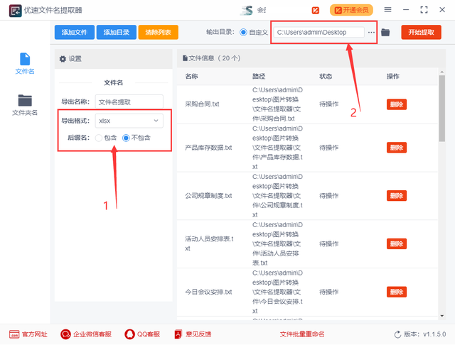 步骤2,先设置文件名提取后的导出格式(txt、xlsx和docx,选择一个即可);然后再选择提取的文件名是否需要包含后缀。最后设置输出目录,用来保存导出的文件。