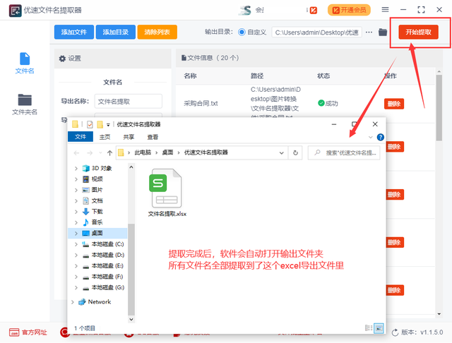 步骤3,点击软件右上角的【开始提取】红色按钮启动软件,提取完成后软件会自动打开输出文件夹,包含所有文件名的导出文件会全部保存在这里。
