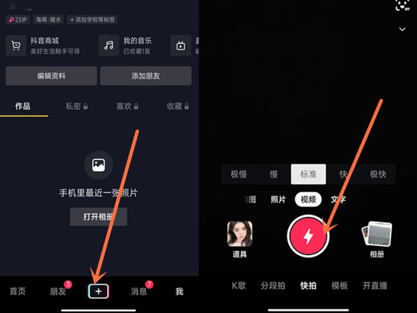 1、打开抖音app,点击底部的+号进行拍摄。