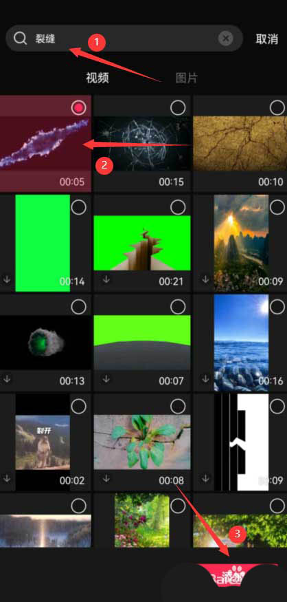 点击素材库按钮,在搜索栏中输入裂缝两个字,选择一段裂缝视频素材,然后点击底部的添加按钮,见下图。