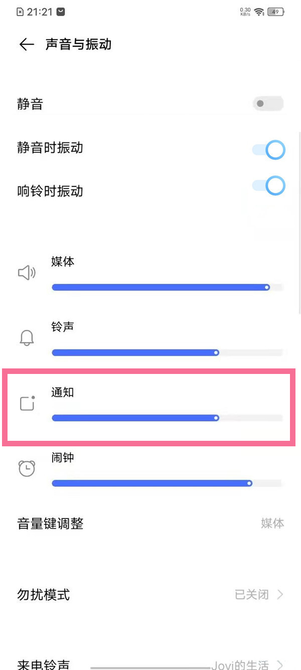 2、向右滑动【通知】下方的滑动按钮设置通知音量大小即可。