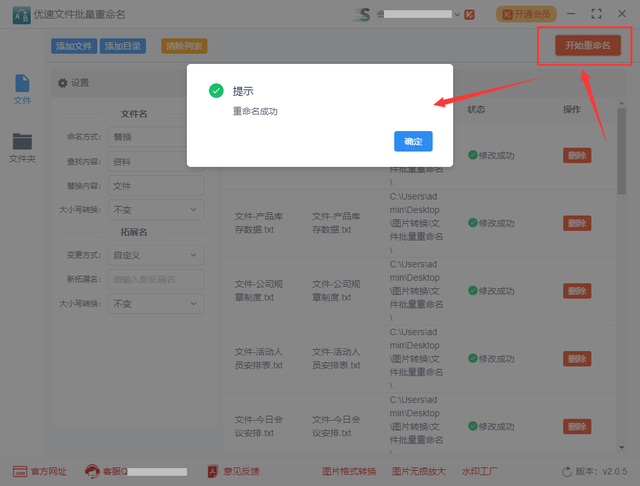 步骤4,设置完成后点击右上角红色按钮启动软件,完成重命名后,软件会弹出重命名成功的提示框。