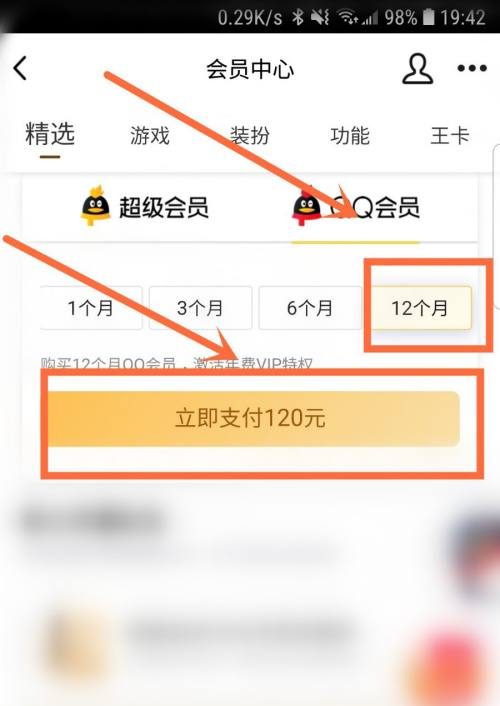 5、在QQ会员开通界面中,点击想选择的月份,如12个月,并点击立即支付进入。