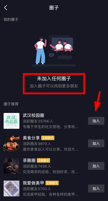 从入口进入,首先可以看到自己加入的圈子,以及推荐的本地圈子。