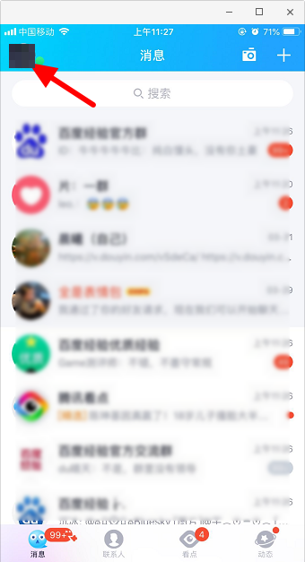 第一步:打开手机qq,点击“头像”。