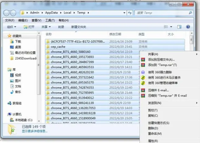 然后,键盘上同时按Ctrl+A ,选择所有临时系统文件,鼠标右击选择删除,删除临时垃圾系统文件。