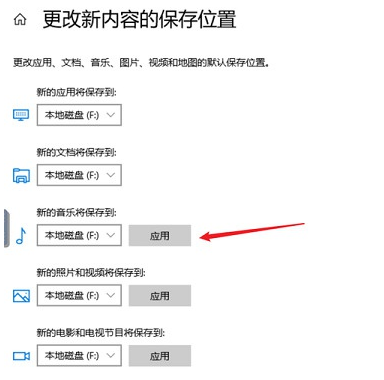 1、在“储存选项”中,点击“更多储存设置”,选择“更改新内容保存位置 ”,选择其他盘如F盘,然后点击“应用”。这样就能将新内容保存在其他盘上,腾出c盘空间。