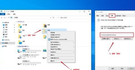 2、对于C盘中现有的内容,可以通过手动转移的办法:打开“此电脑”我们可以看到“文档”、“下载”、“桌面”等文件夹。它们目前默认的路径都是C盘。在“文档”上点开右键,选择“属性”,然后在菜单中选择“位置”,最后再选择“移动”。
