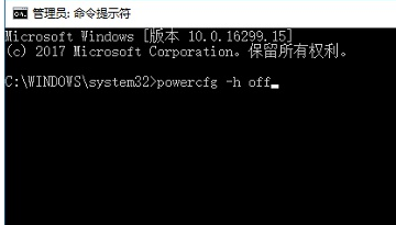 2、接着在弹出的命令行中输入:powercfg -h off,回车就可以关闭系统休眠功能了。(开启休眠功能需输入命令:powercfg -h on)