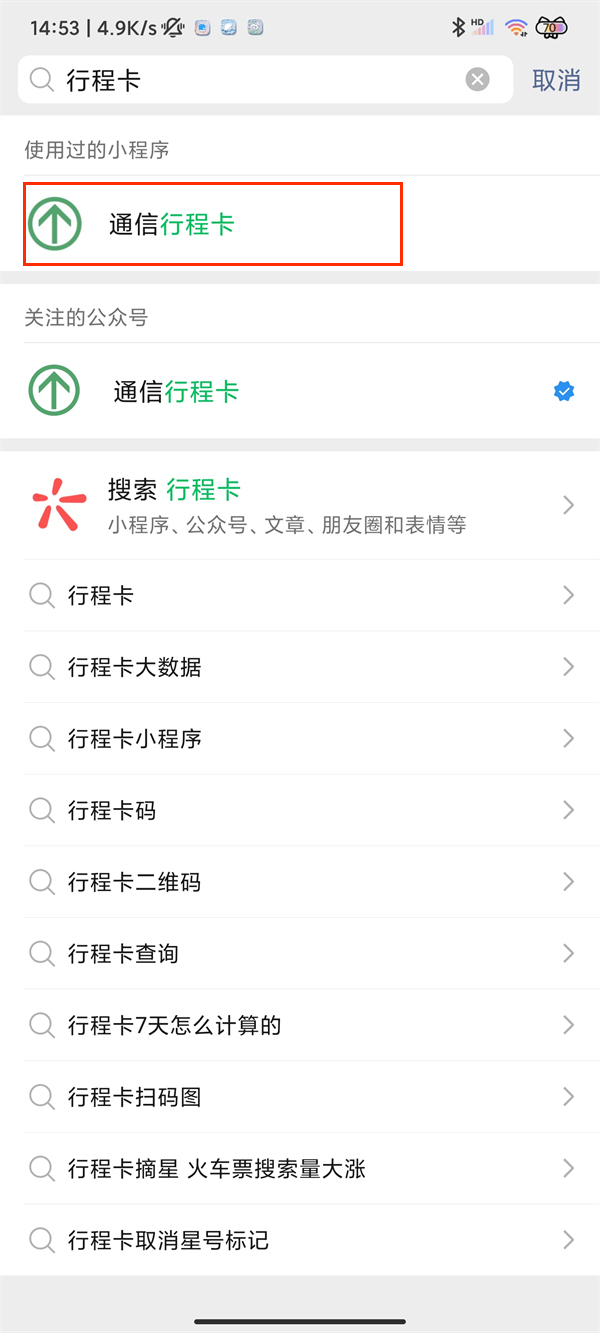 1、打开微信,搜索行程卡,并点击进入通信行程卡的登录页面。