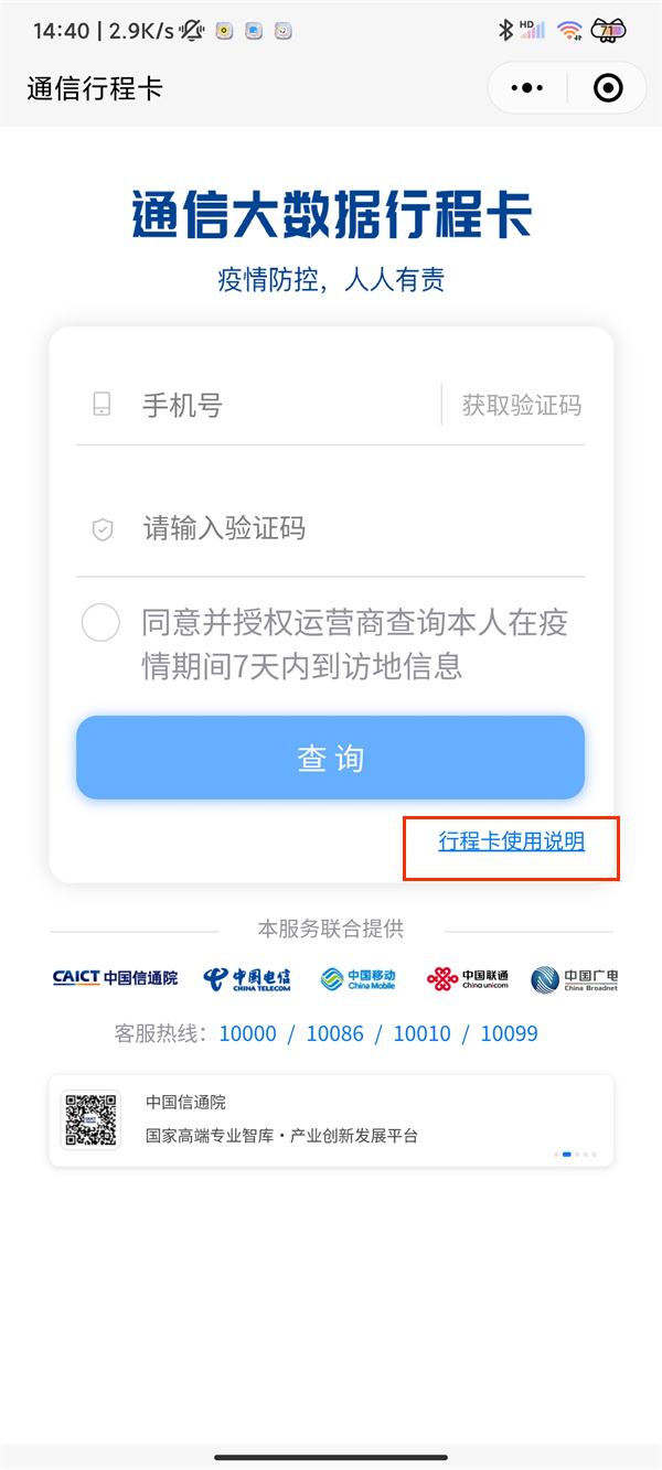 1、主要功能和流程 通信行程卡查询服务主要面向中国手机用户,能够查询个人国内和国际前7天内的行程,国内精确到省市(连续停留4小时以上),国外精确到国家。查询由用户主动发起,可用手机软件(微信、支付宝等)扫码接入查询页面,或微信/支付宝小程序搜索“通信行程卡”进入小程序,输入手机号码并点击获取验证码,验证成功后点击查询,即可返回查询结果。 注:新开卡的用户满7天后才能使用行程查询服务 。