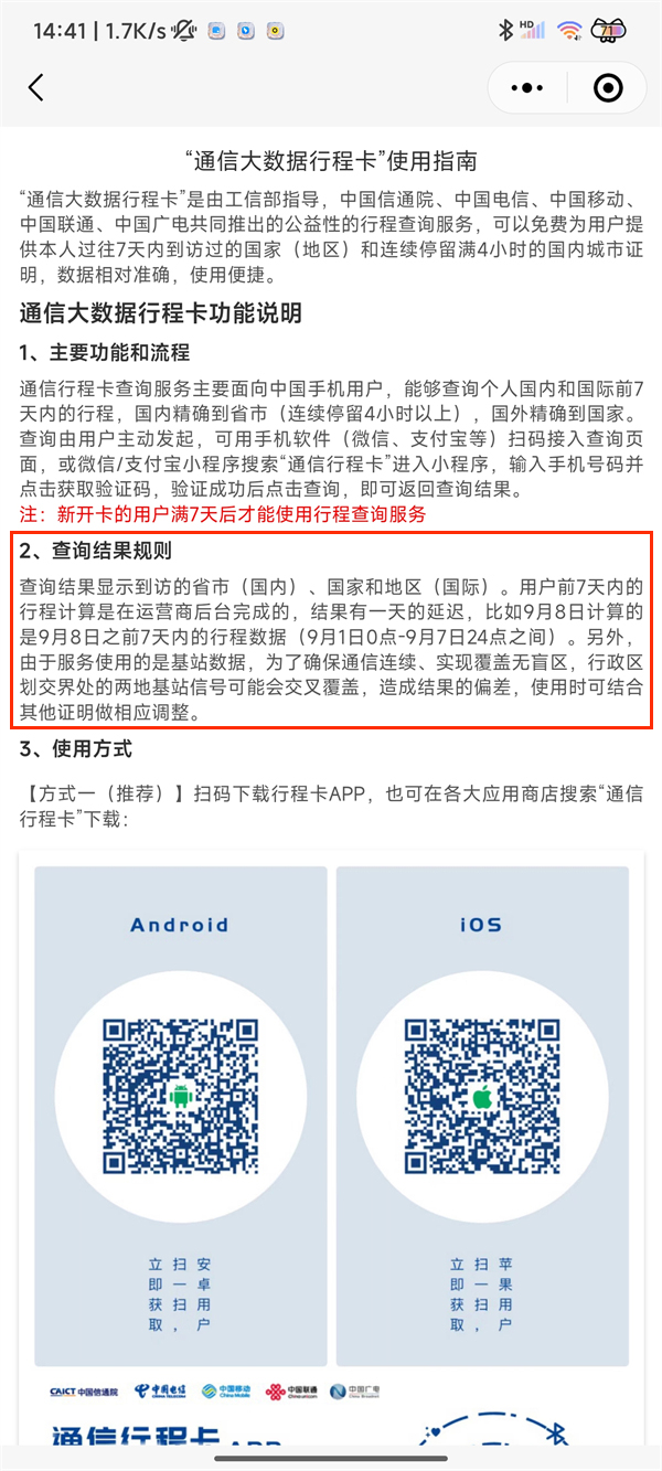 通信行程卡七天计算是在运营商后台完成的,结果有一天的延迟,比如9月8日计算的是9月8日之前7天内的行程数据(9月1日0点-9月7日24点之间);国内精确到省市(连续停留4小时以上),国外精确到国家。