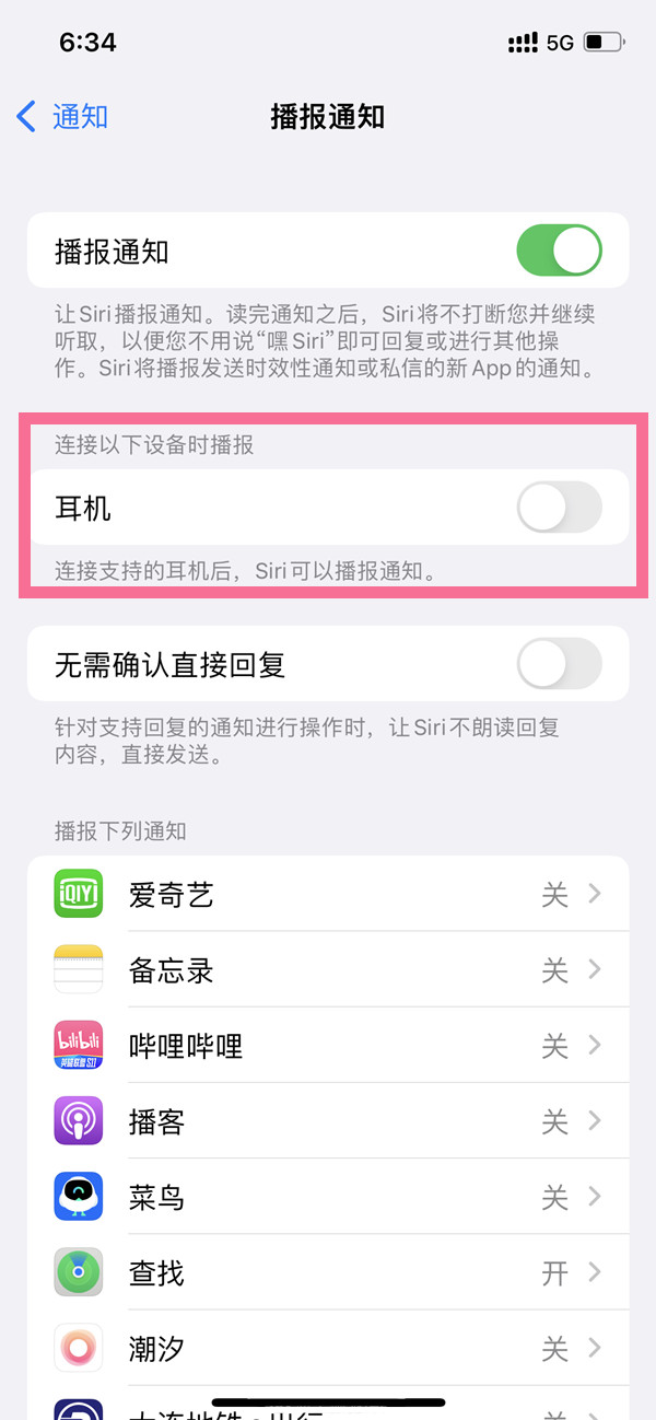 2、点击进入播报通知,关闭【耳机】右侧的开关。