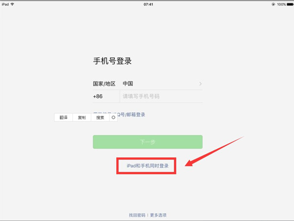 1、打开平板微信,在登录页面点击【ipad和手机同时登录】。