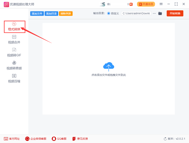 步骤1,在电脑上下载“优速视频处理大师”工具软件,然后安装并打开使用。界面左边可以看到五个功能,我们点击最上面的【格式转换】功能。