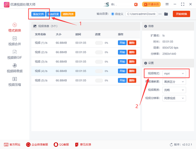 步骤2,点击【添加文件】按钮将ts视频文件添加到软件中,也可以直接用鼠标将文件拖入软件进行添加,支持批量格式转换;然后在视频格式右边选择“mp4”,这样就能将格式转换成mp4了。