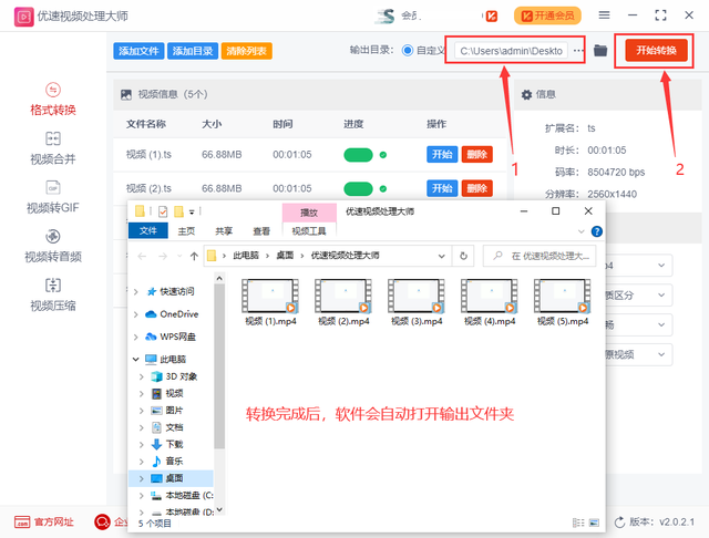 步骤3,先设置输出目录,用来保存转换后的mp4视频;然后点击右边的【开始转换】红色按钮启动格式转换,转换完成后软件会自动弹出输出文件夹,方便我们查看转换成的视频文件。